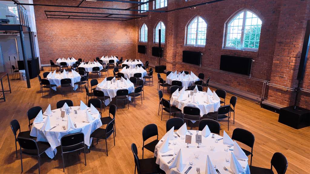 Tegelsalen är vår nya, unika eventlokal där historisk charm möter modern funktionalitet. Med en imponerande takhöjd på 6 meter och bevarade detaljer som originaltegel och fönster från 1800-talet, erbjuder Tegelsalen en atmosfär som andas både tradition och framtid. Lokalens vackra ekgolv och det öppna köket skapar en inbjudande miljö för möten och event som inte liknar något annat.